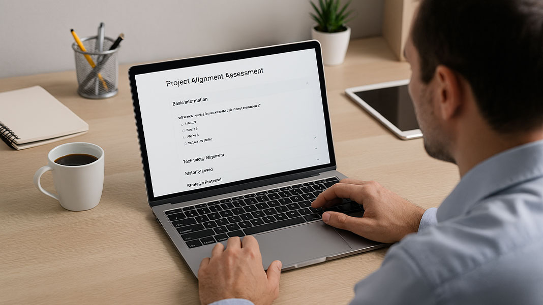 A plataforma oferece um primeiro diagnóstico autónomo sobre o alinhamento tecnológico, o grau de maturidade e o potencial estratégico dos projetos face às prioridades definidas pela União Europeia. O processo baseia‑se em quatro blocos de questões e só pode ser submetido uma vez, garantindo que a análise reflete com rigor a realidade do projeto.